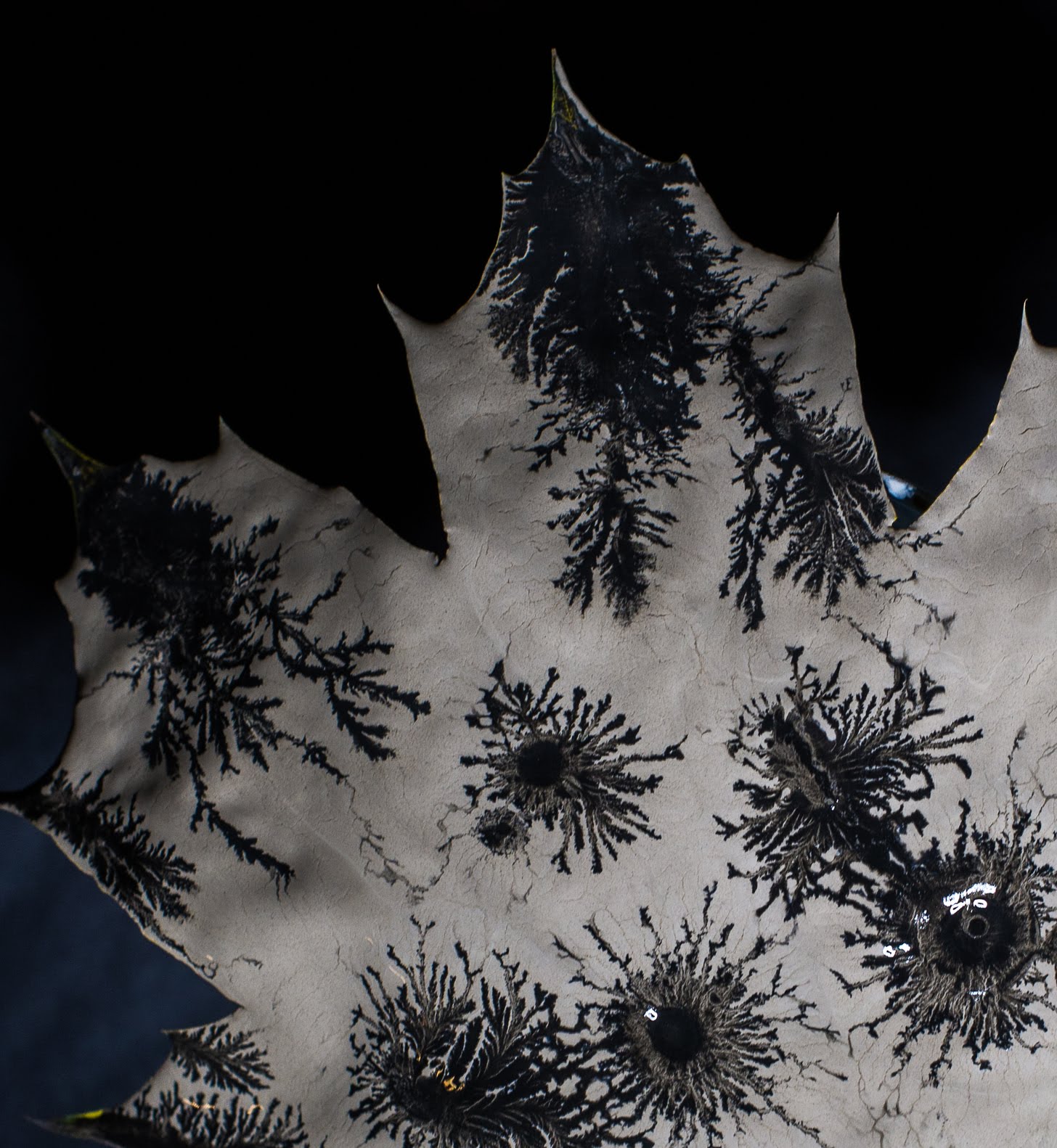I found a process of pottery called mocha diffusion. Using slip (liquid clay) you can apply a mild acid (vinegar or citrous juice) with a color added. The acid eats away at the surface of the slip carrying the colorant with it. It creates a fractal effect